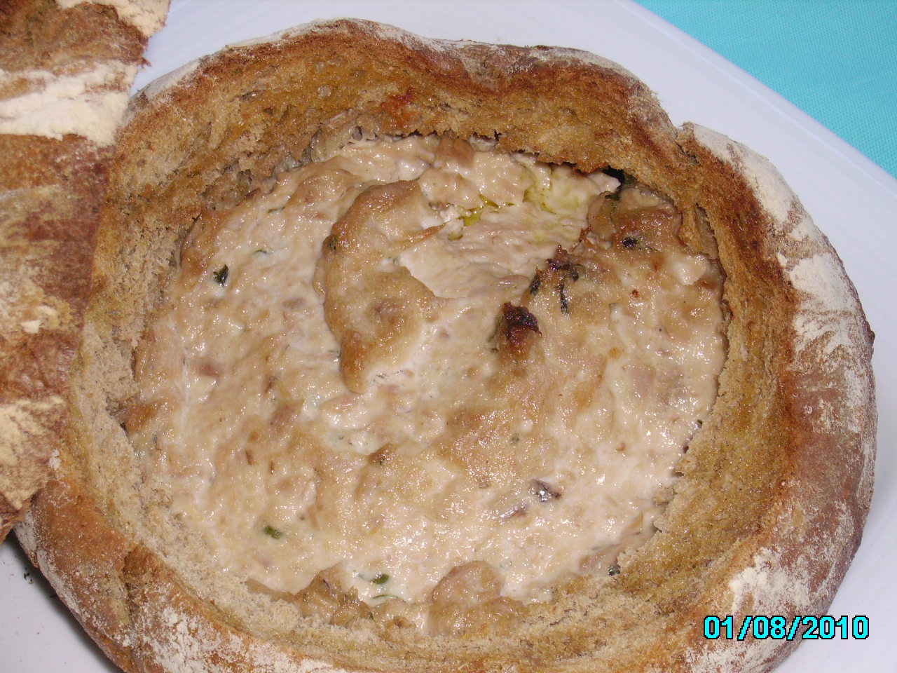 Começa-se por se abrir o pão por cima, para lhe retirar o miolo. Depois pincela-se o pão por dentro com azeite. Misturam-se todos os ingredientes até ficar uma papa e coloca-se dentro do pão, que entretanto vai ao forno, pré aquecido cerca de 15 minutos. Convém tapar com uma folha de alumínio para que não queime rápidamente por causa da gordura do azeite.