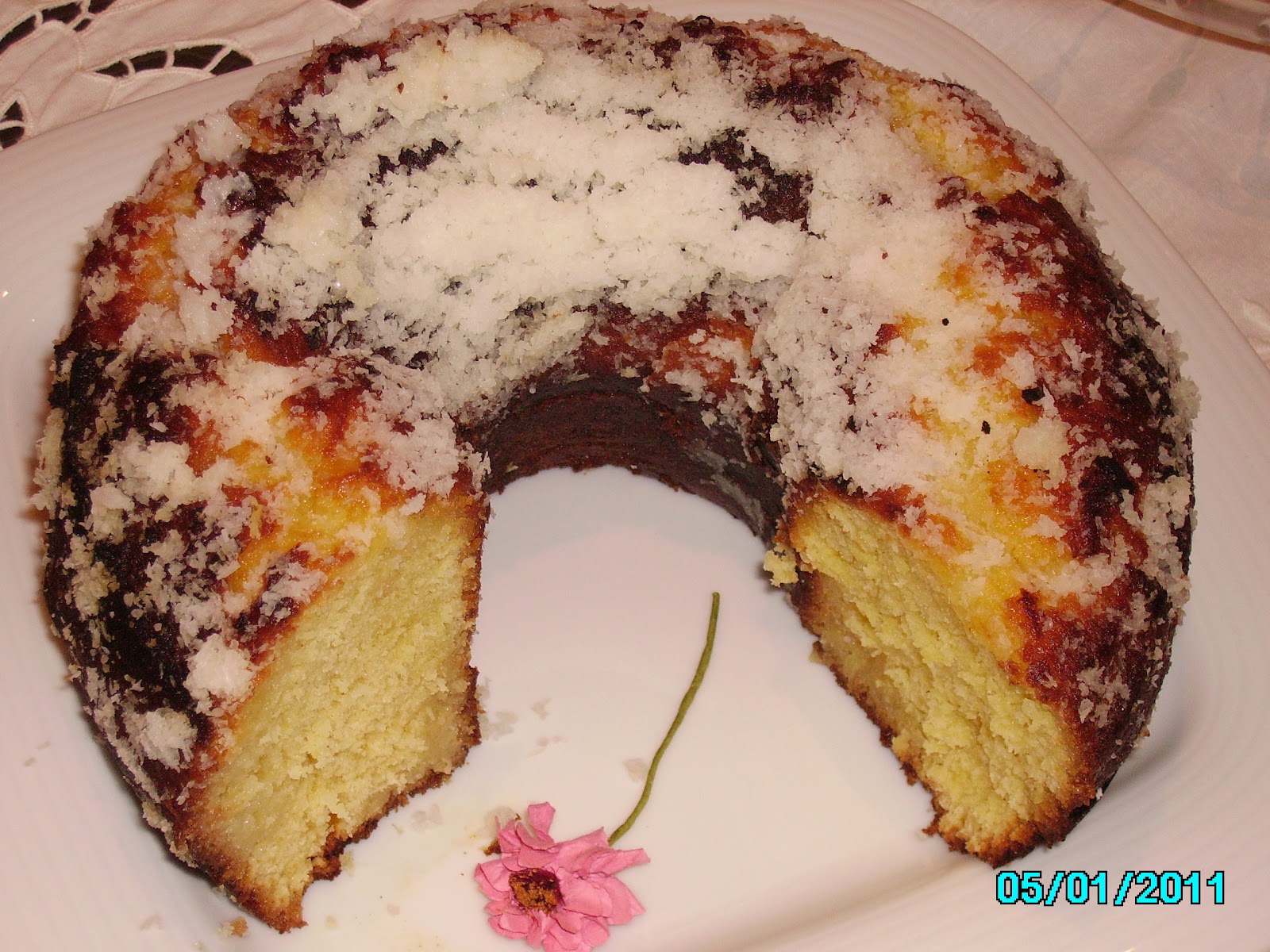 Bater as claras em castelo e reservar. Bater as gemas com o açúcar até ter um creme fofo e esbranquiçado. Adicionar a manteiga derretida, a farinha, o leite, o coco e o fermento, batendo sempre entre cada adição. Envolver por fim as claras e levar ao forno numa forma de buraco cerca de 30 minutos a 180º.